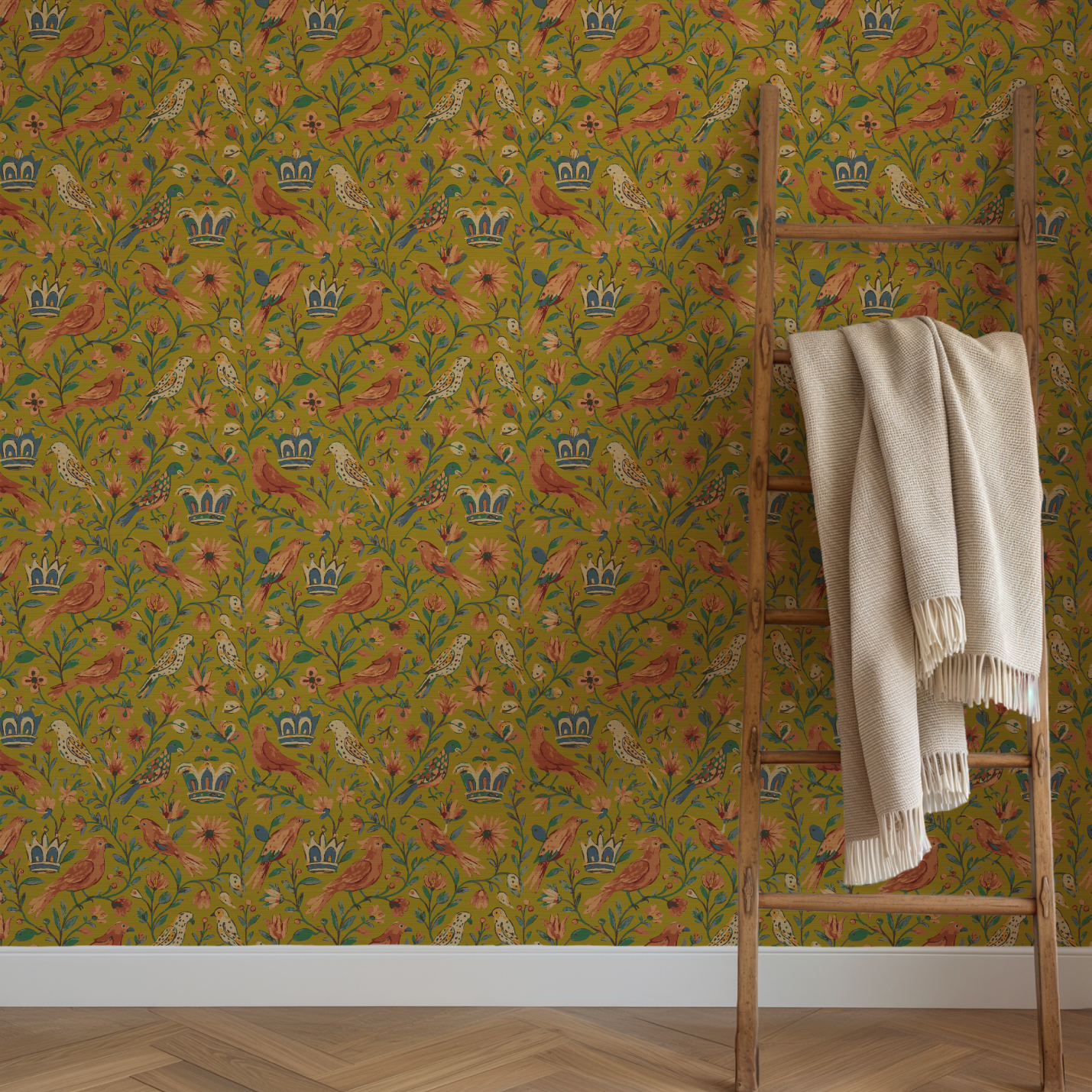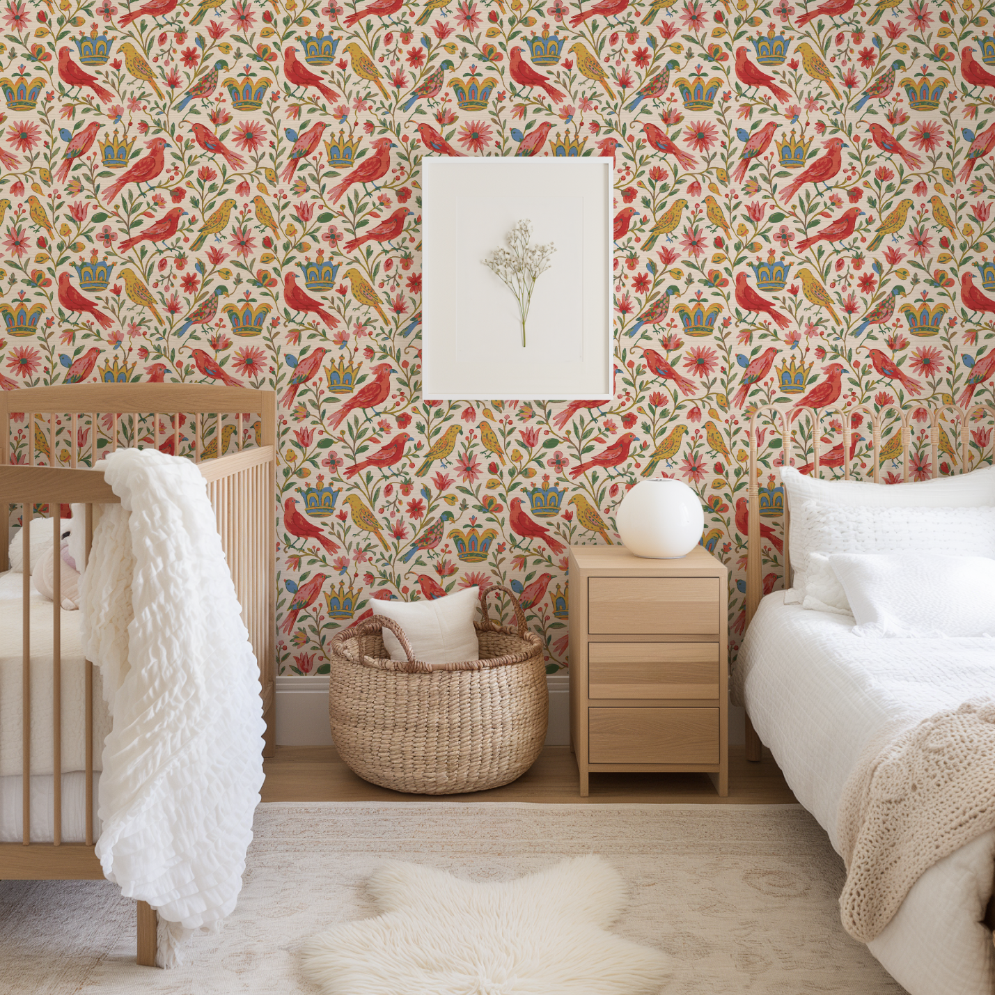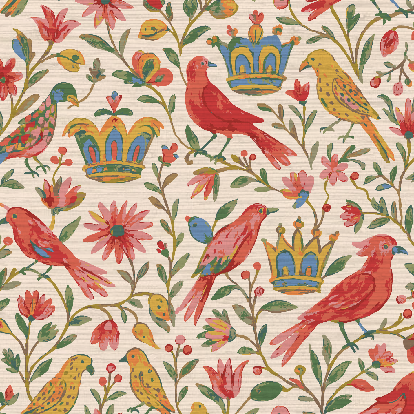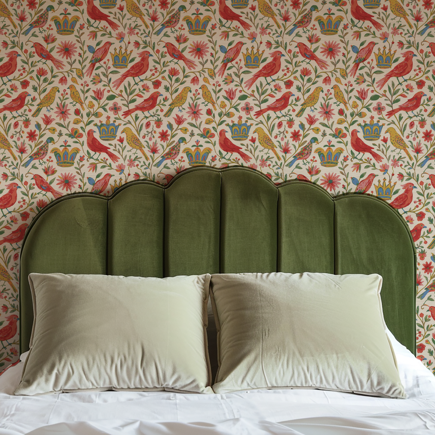 A celebration of color, craft, and joy, Heritage Flight takes flight with painterly birds, blooming florals, and crowned details that nod to vintage folk art. Hand-painted in rich hues of coral, gold, blue, and green, this lively wallpaper brings a sense of movement and story to every wall. The layered brushstrokes and textured ground give it an artisanal warmth that feels timeless yet full of personality – perfect for powder rooms, entryways, or creative spaces that love to make a scene.