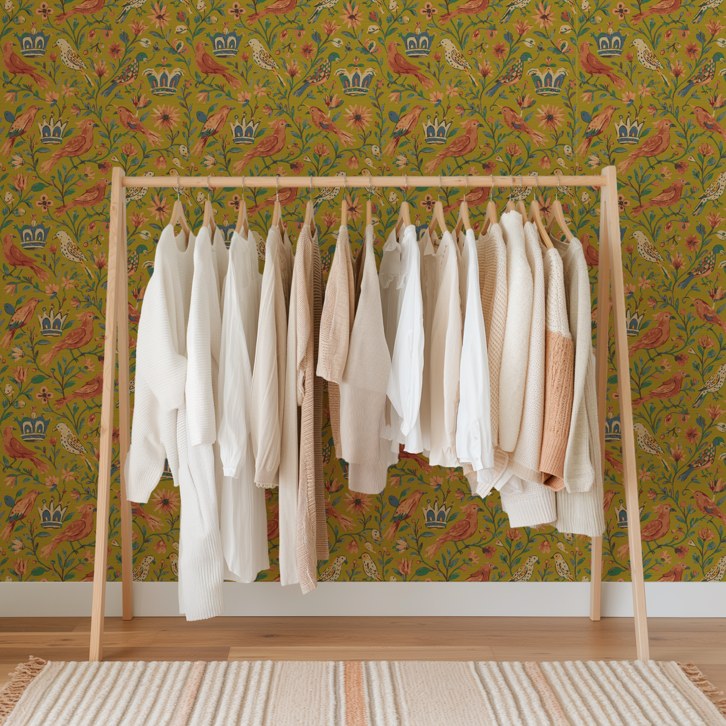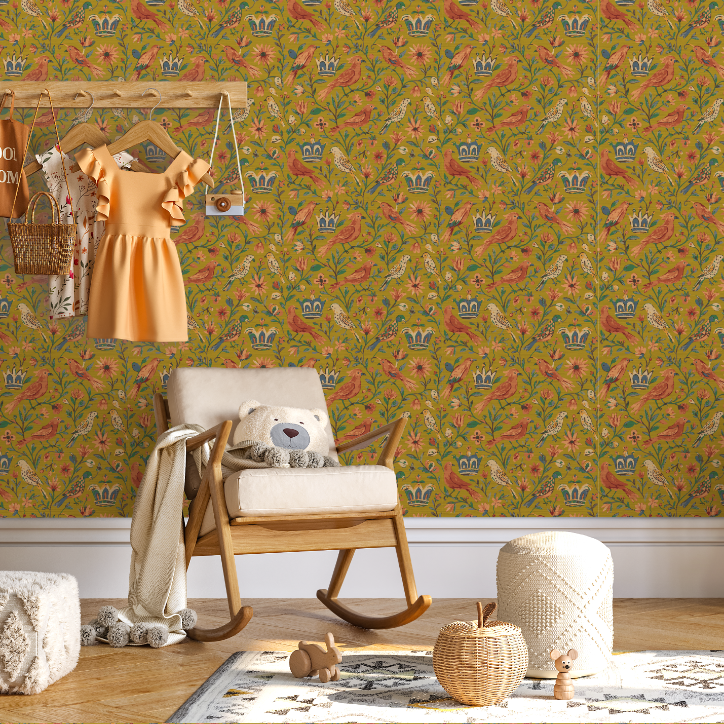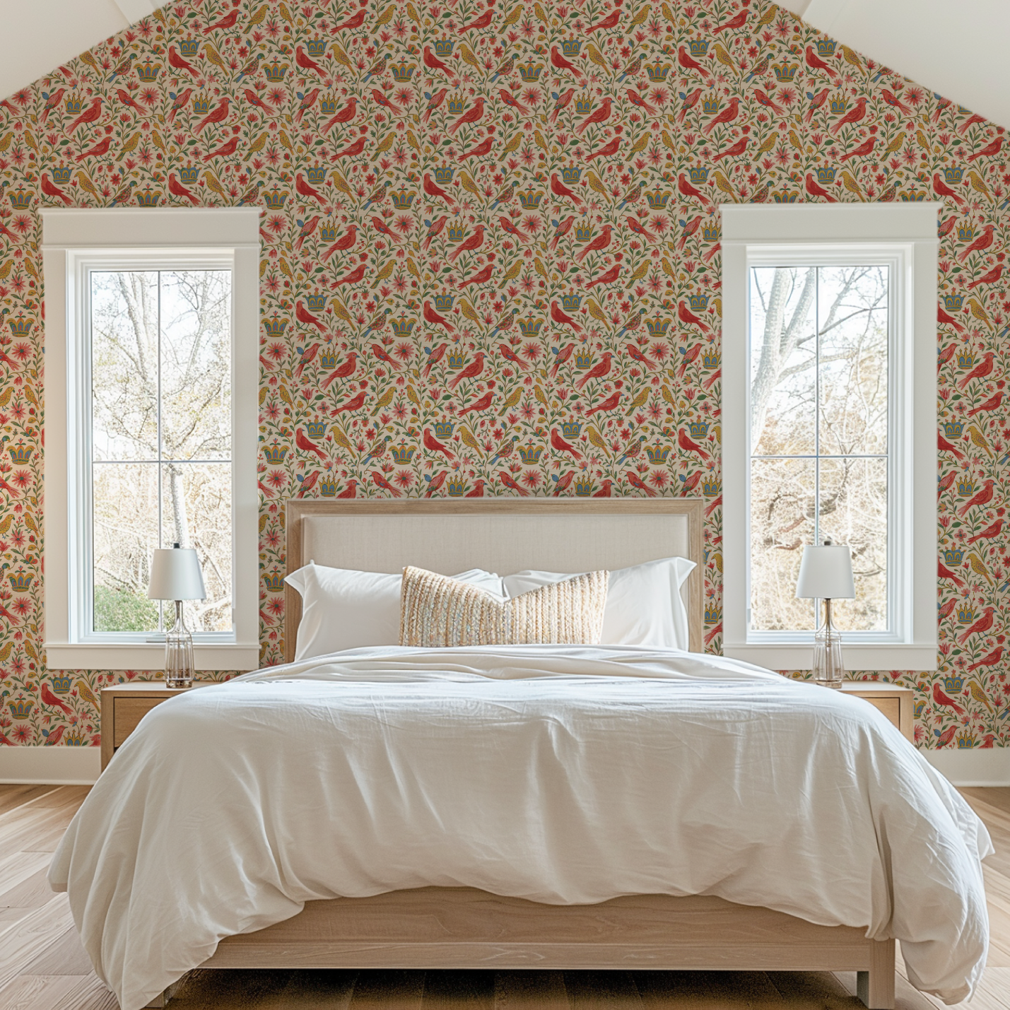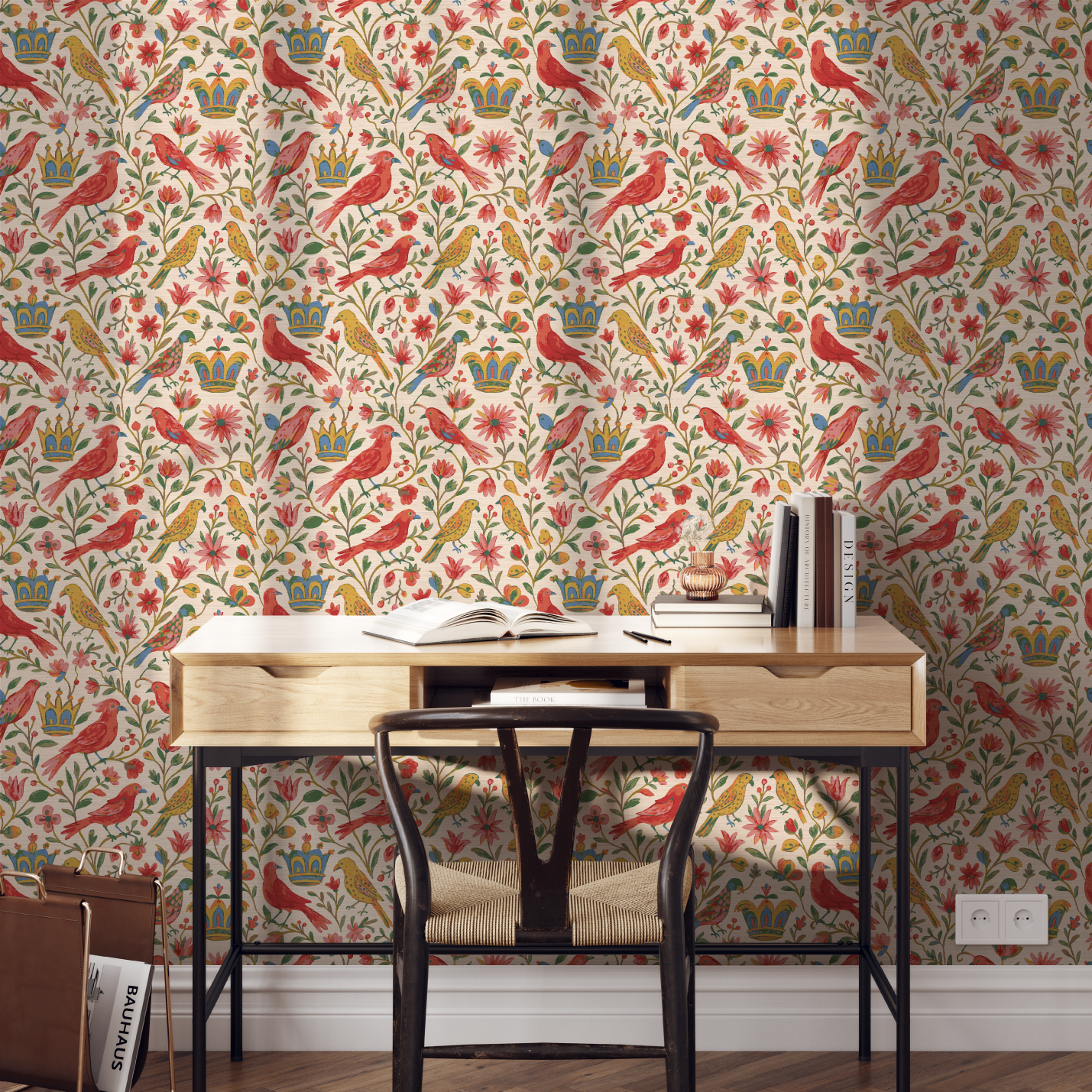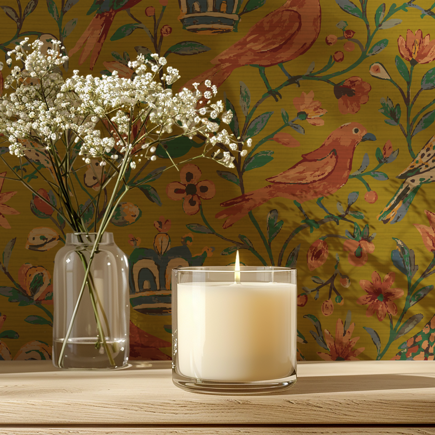 A celebration of color, craft, and joy, Heritage Flight takes flight with painterly birds, blooming florals, and crowned details that nod to vintage folk art. Hand-painted in rich hues of coral, gold, blue, and green, this lively wallpaper brings a sense of movement and story to every wall. The layered brushstrokes and textured ground give it an artisanal warmth that feels timeless yet full of personality – perfect for powder rooms, entryways, or creative spaces that love to make a scene.