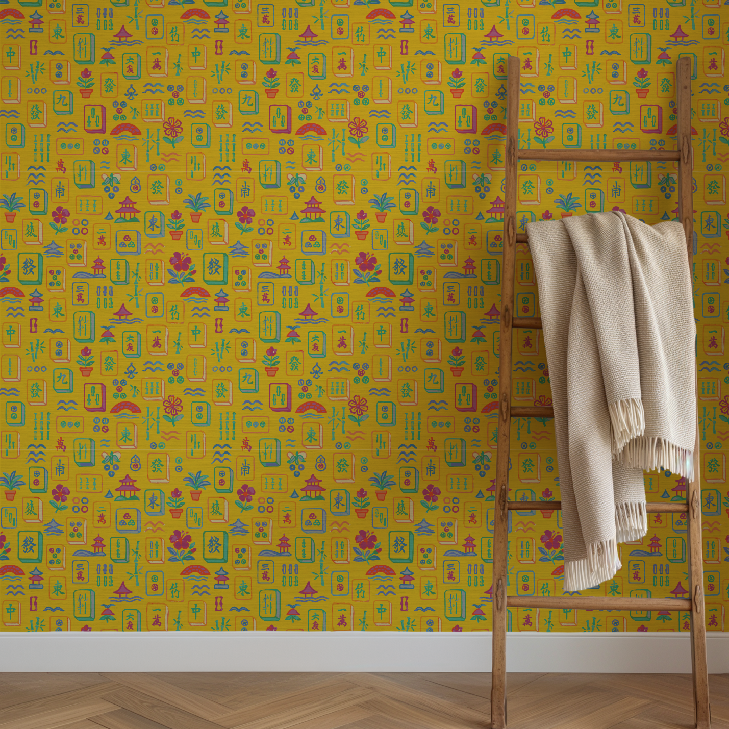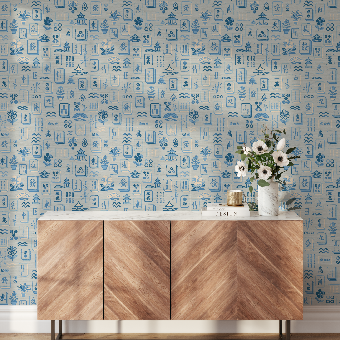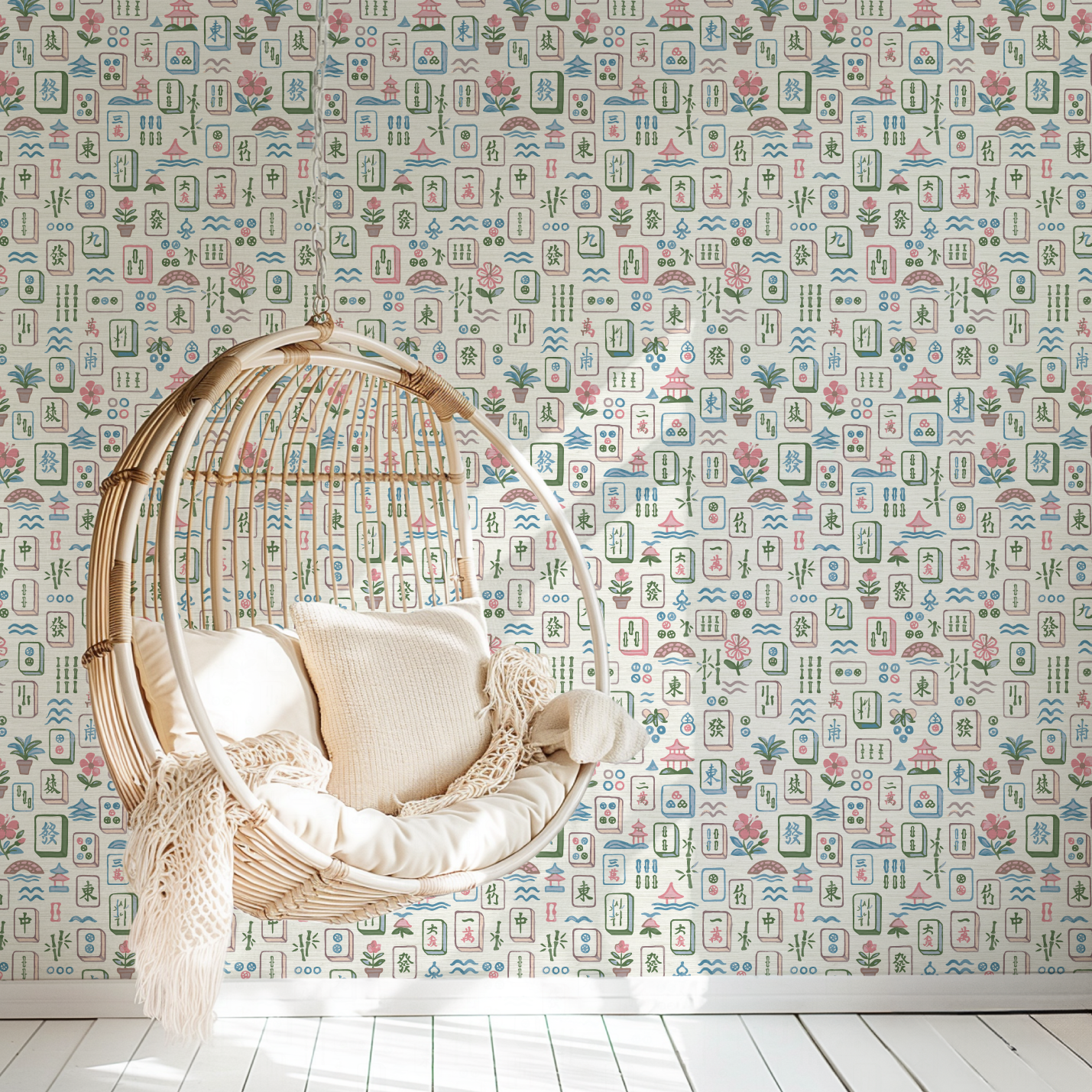 Meet Maison Mahjong, a painterly wallpaper that plays like a love letter to leisure. Hand-drawn in soft brushstrokes of blush pink, jade green, and seaside blue, each tile captures the joy of a timeless game reimagined through an artist’s eye. Potted palms, pagodas, and floating blossoms dance across a sun-washed ground, creating a print that feels both nostalgic and delightfully unexpected. Perfect for spaces that crave charm, color, and a wink of wanderlust.
